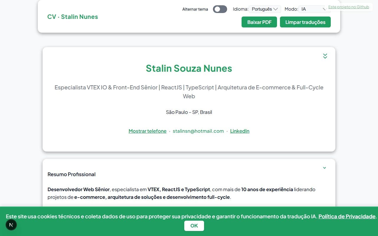 Currículo interativo, multilíngue e acessível. Tradução com IA sob demanda, exportação para PDF com layout refinado e alternância de tema.